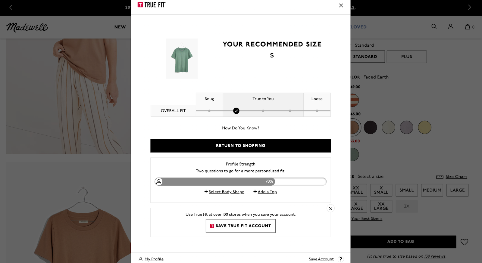 Madewell uses the True Fit questionnaire, asking what size feels best in well-known brands. Based on this information, they will recommend which size would fit you (and the type of fit) in the Madewell brand. This provides an easy reference point and puts into context Madewell’s sizing without the customer having to dig out a tape measure.
